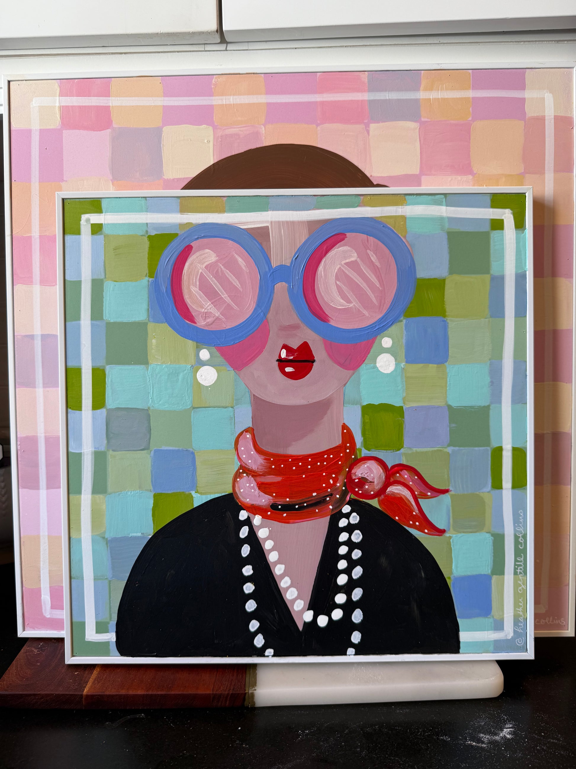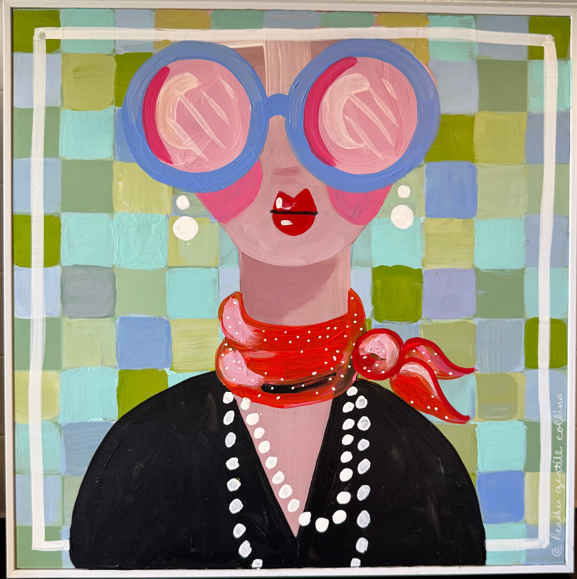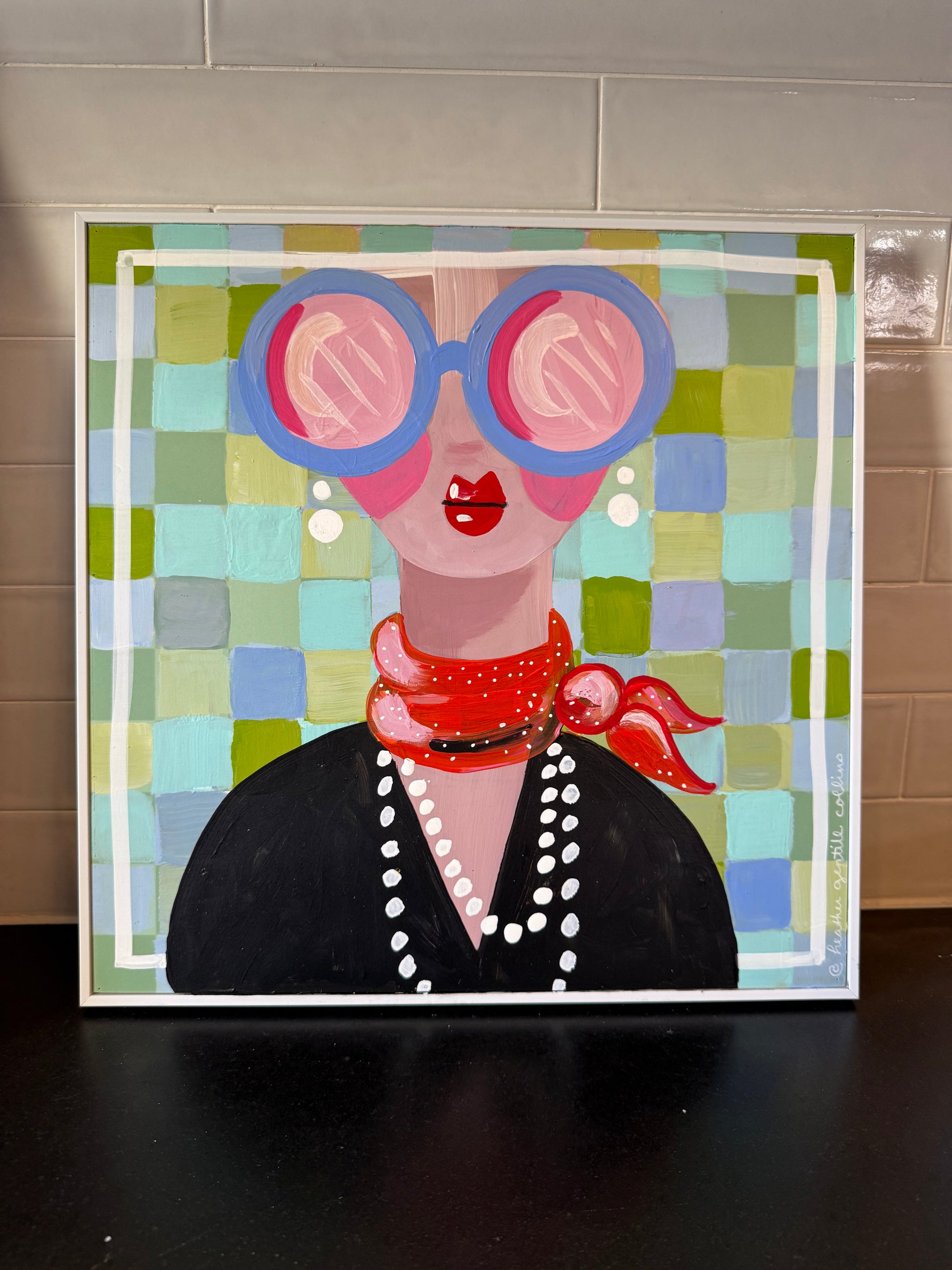 Oroginal acrylic painting on board in a white frame 14 x 14” Inspired by a young Iris Apfel Part of my Children’s Series