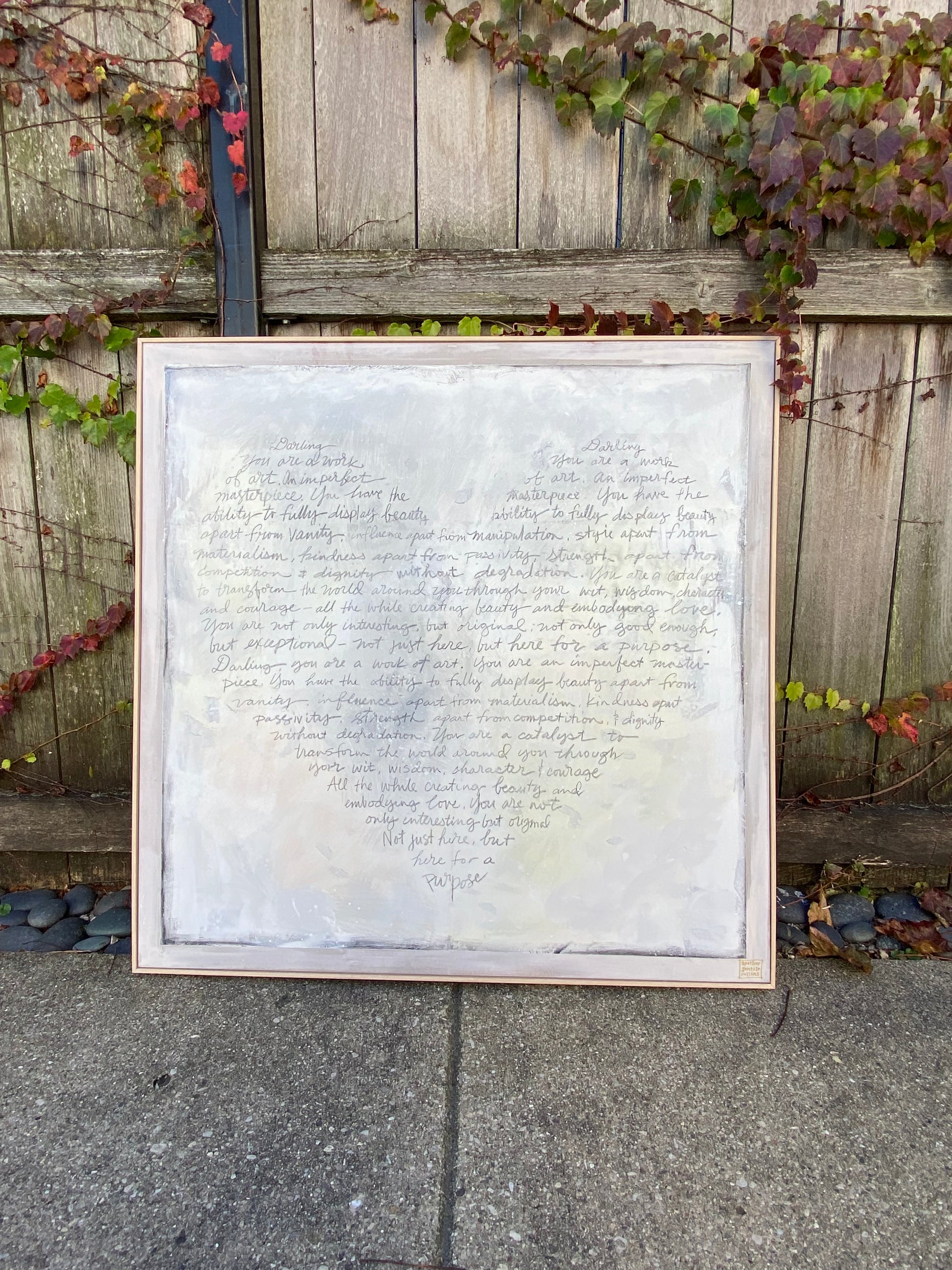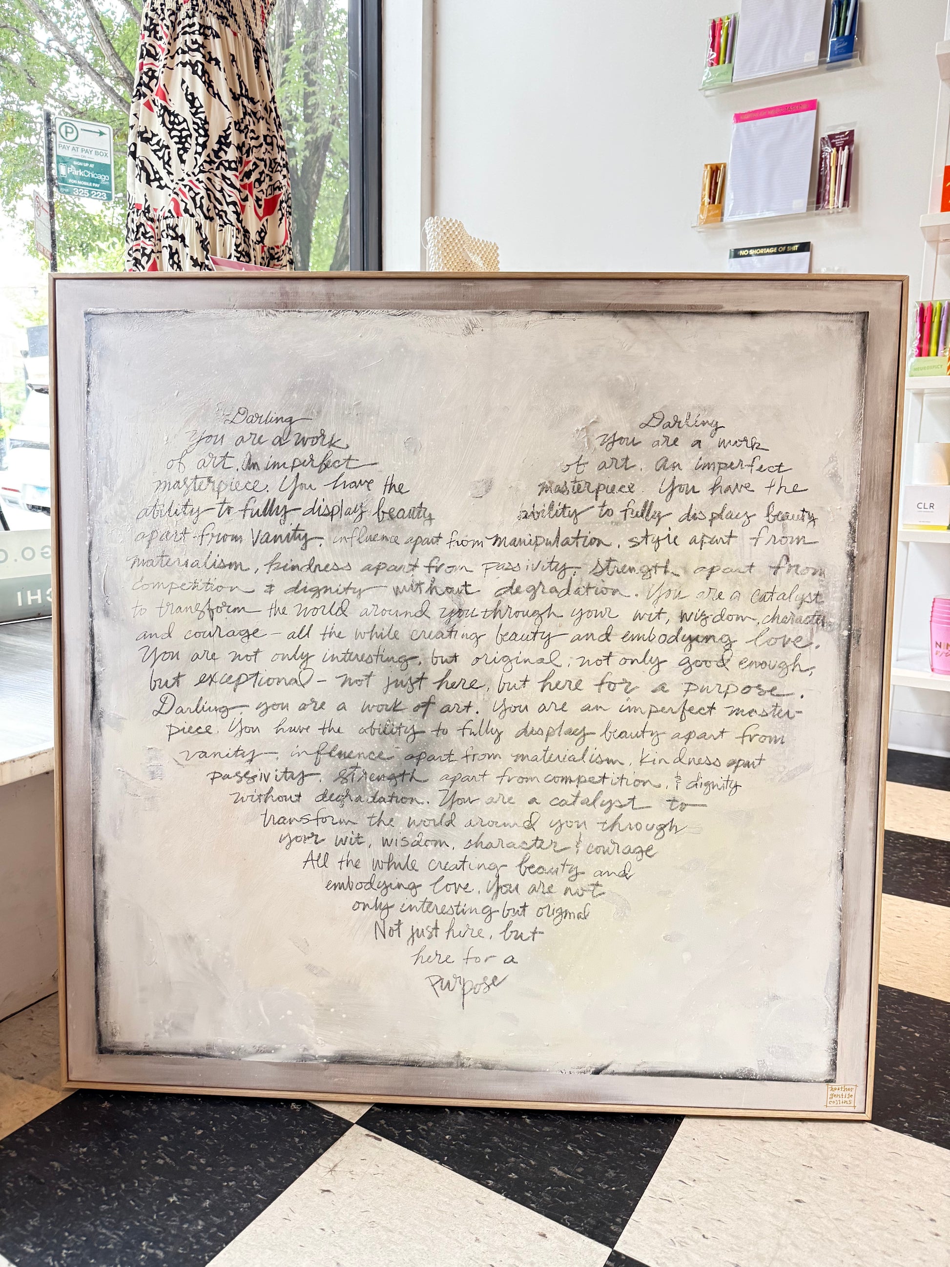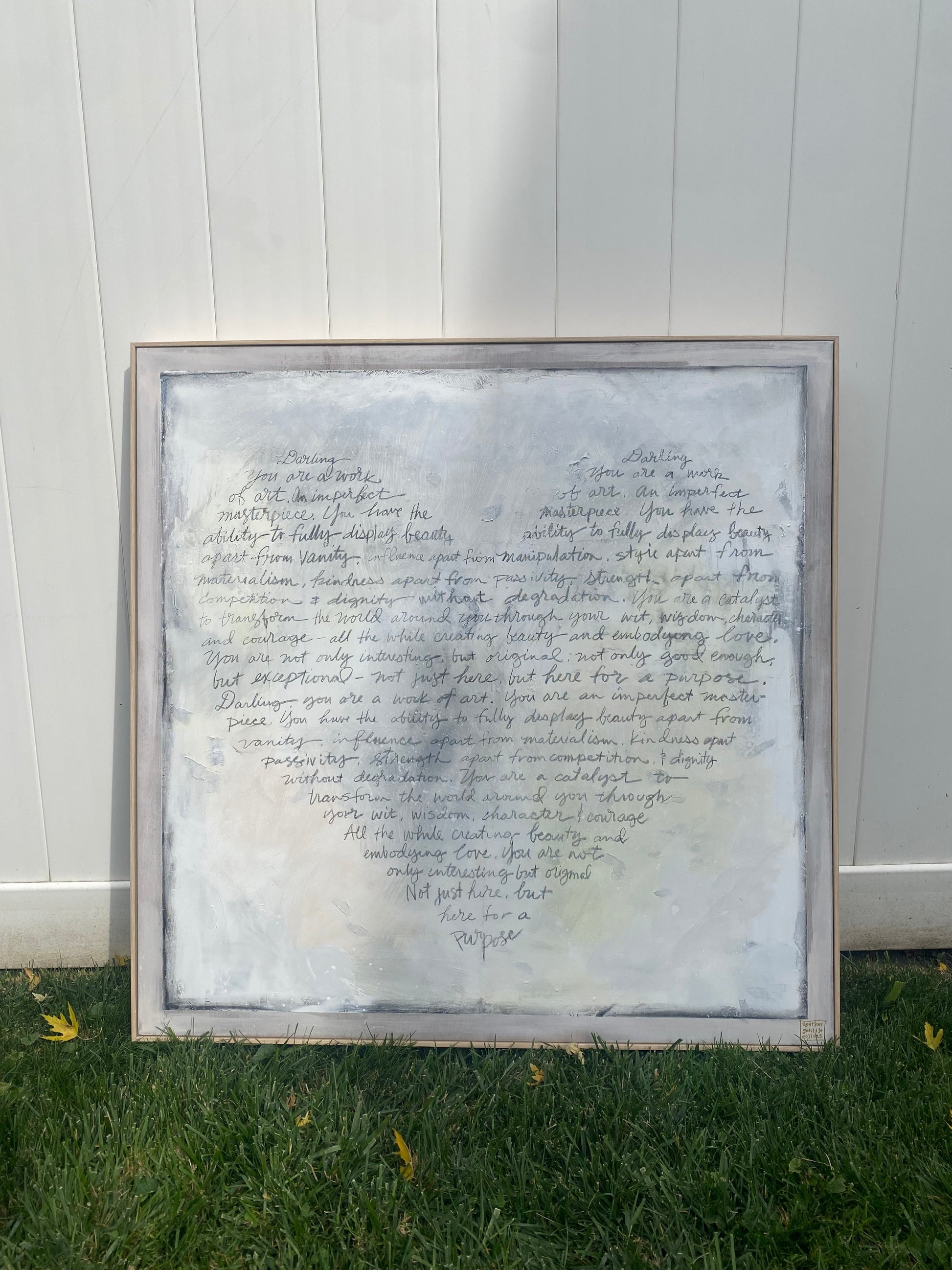 Heather’s heART painting series is all about celebrating the joy in life’s messy moments. “ Poem” features the artists favorite all time poem titled “ Darling”. So, come and let this painting inspire you to appreciate the journey itself.