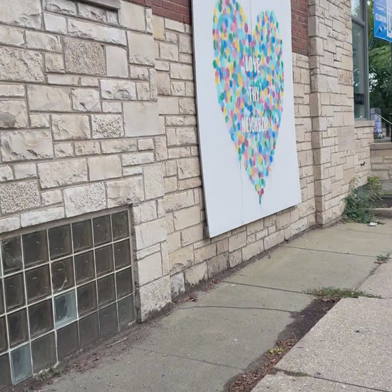 I painted the " Love thy Neighbor" mural late December 2020 as a way to close out a monumental year and invited the community and families to paint with me. One spray painted splat at a time neighbors came together and the message emerged. It still brings positivity to the neighborhood along a busy street and public park in the heart of Chicago. This is who we are Chicago. Located at Damen and Wellington, You can see the whole video making of the mural in my Instagram @heathergentilecollins